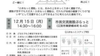 「ふまねっと運動」とは、あみの上をゆっくり歩く運動です。運動が苦手でも大丈夫!ふまねっと運動は、だれもが地域の健康づくりの"担い手"として活躍することができるように考えられた資格です。 開催概要 日時:12月15日(月)14:30~16:0...