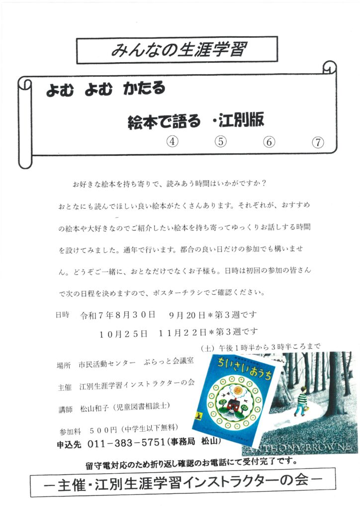 おとなにも読んでほしい良い絵本がたくさんあります。それぞれが、おすすめの絵本や大好きなのでご紹介したい絵本を持ち寄ってゆっくりお話しする時間を設けてみました。通年で行います。都合の良い日だけの参加でも構いません。どうぞご一緒に、おとなだけでなくお子様も。日時は初回の参加の皆さんで次の日程を決めますので、ポスターちらしでご確認ください。