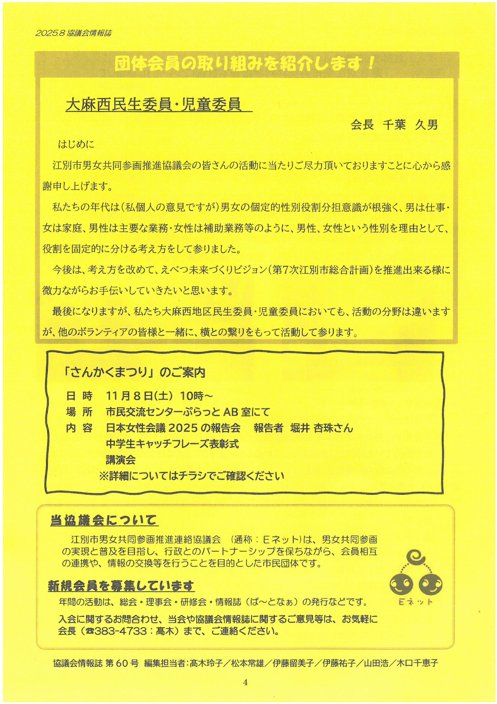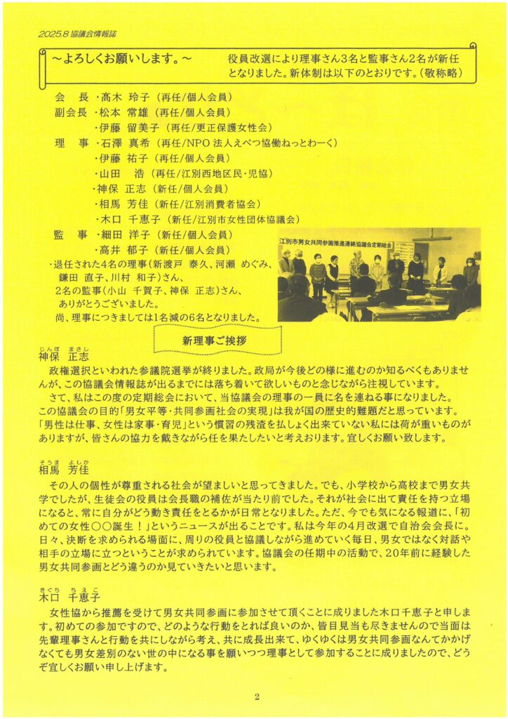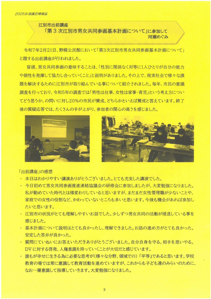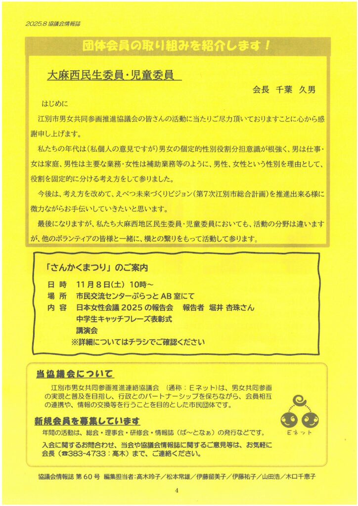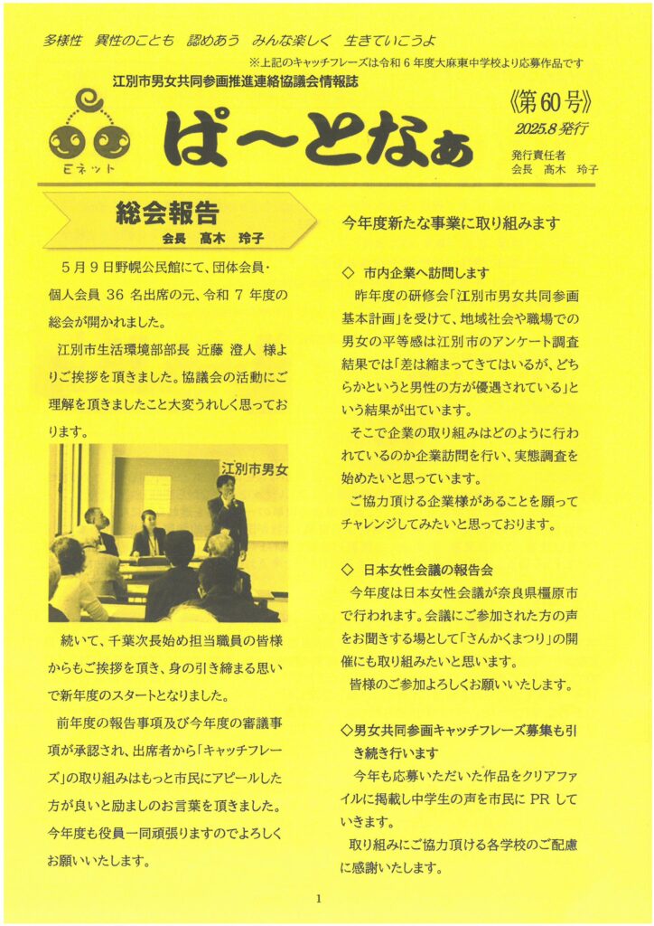 江別市男女共同参画推進連絡協議会情報誌『ぱ~となぁ 第60号』発行しました 江別市男女共同参画推進連絡協議会 2025年9月16日 掲載内容(見出し一覧) 総会報告(会長 高木玲子) 今年度新たな事業に取り組みます ・市内企業へ訪問します ・日本女性会議の報告会 ・男女共同参画キャッチフレーズ募集も引き続き行います 新役員のご紹介・新理事ご挨拶 江別市出前講座「第3次江別市男女共同参画基本計画について」に参加して(河瀬めぐみ) 団体会員の取り組み紹介:大麻西民生委員・児童委員 「さんかくまつり」のご案内(11月8日開催)