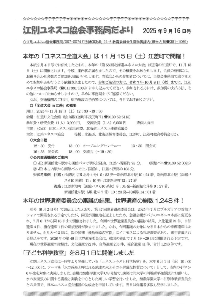「江別ユネスコ協会事務局だより」2025年6月2日号を発行しました 江別ユネスコ協会 2025年9月20日 トピック 本年の「ユネスコ全道大会」は11月15日(土)江差町で開催! 本年の世界遺産委員会の審議の結果、世界遺産の総数1,248件! 「子ども科学教室」を8月1日に開催しました