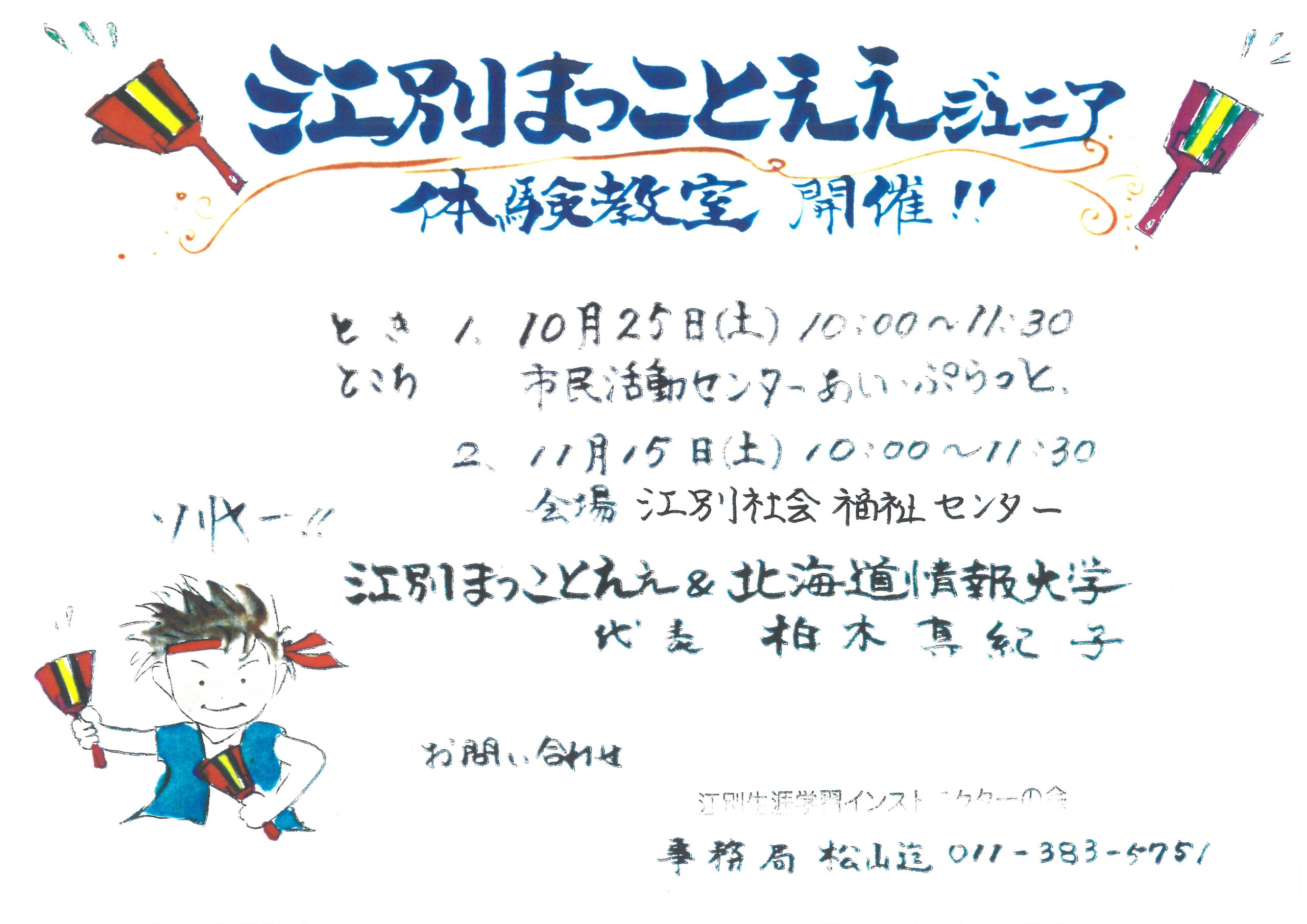 江別まっことえぇジュニア 体験教室 開催! 江別生涯学習インストラクターの会 2025年10月4日 🗓 開催日程 第1回:10月25日(土)10:00~11:30 会場:江別市民活動センター・あい(市民交流施設ぷらっと) 第2回:11月15日(土)10:00~11:30 会場:江別社会福祉センター 📞 お問い合わせ 江別生涯学習インストラクターの会事務局:松山まで(TEL:011-383-5751)