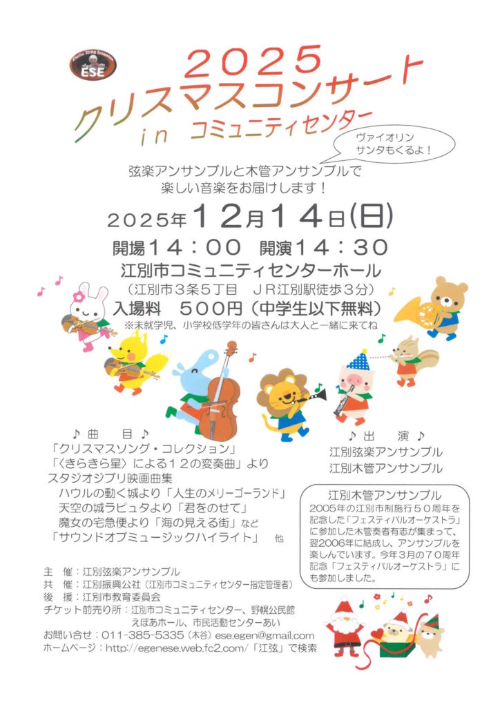- 問い合わせ: 江別弦楽アンサンブル(TEL: 011-385-5335(木谷) / E-mail: ese.egen@gmail.com)