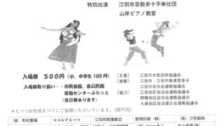 開催概要 日時: 令和6年10月6日(日) 午前10:00 開演 場所: 江別市民会館 大ホール 入場料: 500円(小・中学生 100円) オープニング: ピアノ演奏 宮武玲子さん 入場券取り扱い場所 市民会館 各公民館 活動センターぶら...