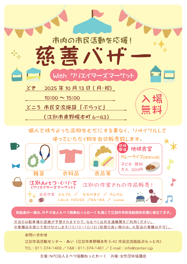 ※収益金の一部は、NPO法人えべつ協働ねっとわーくを通して江別の市民活動支援に役立てます。