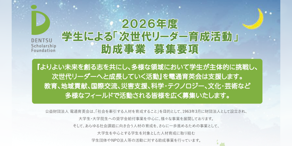 【公益財団法人 電通育英会】2026年度 学生による「次世代リーダー育成活動」助成事業