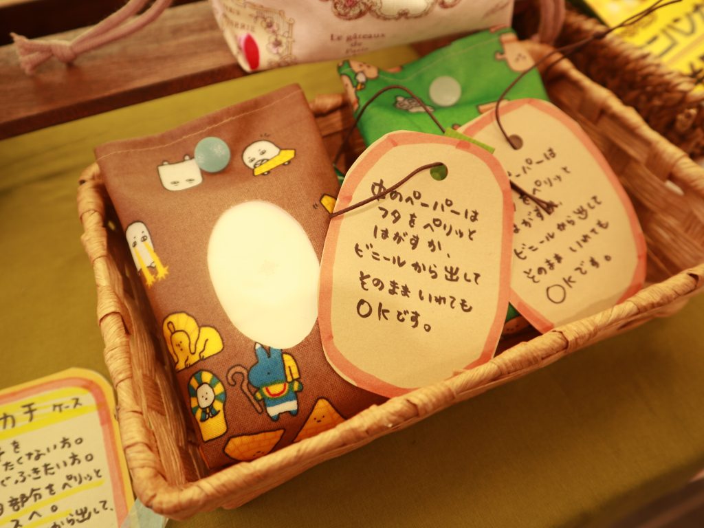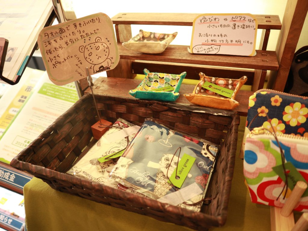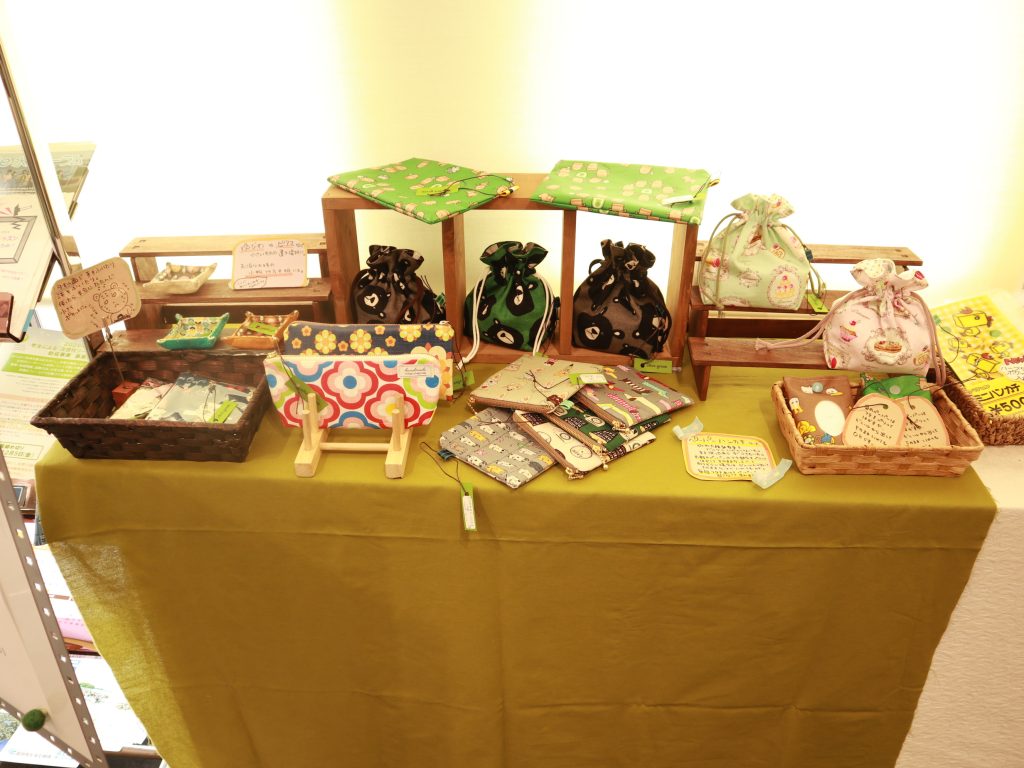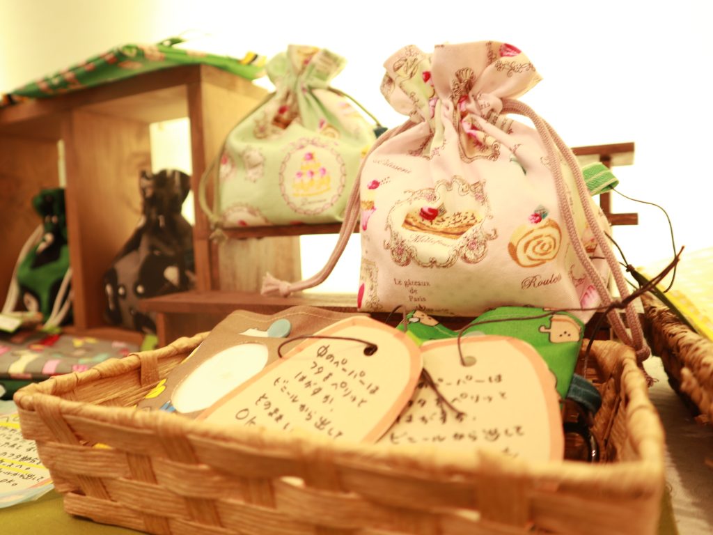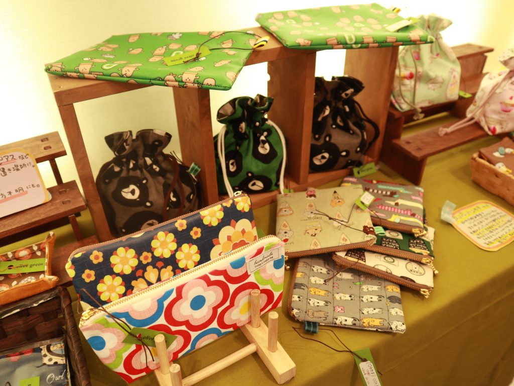 今回は、巾着やポーチ、小物入れ、ハンカチ入れ、手に取りやすいサイズ感とデザインにこだわった作品が並んでいます。